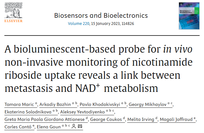 [1] Maric T, Bazhin A, Khodakivskyi P, Mikhaylov G, Solodnikova E, Yevtodiyenko A, Giordano Attianese GMP, Coukos G, Irving M, Joffraud M, Cantó C, Goun E. A bioluminescent-based probe for in vivo non-invasive monitoring of nicotinamide riboside uptake reveals a link between metastasis and NAD+ metabolism. Biosens Bioelectron. 2022 Oct 29;220:114826. doi: 10.1016/j.bios.2022.114826. Epub ahead of print. PMID: 36371959.
