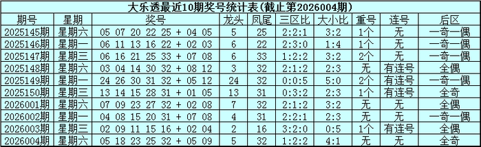 大乐透第2026004期奖号为:05、18、23、25、32+05、09。其中前区三区比为1:2:2,大小比为4:1,莫得出现重号,莫得出现连号,后区为全奇号码。