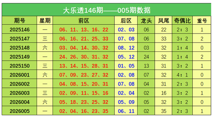 大乐透第2026005期出奖号统计:前区02、04、16、23、35,后区06、11。龙头02漳州开发区炽昌砂业有限公司,凤尾35,奇偶比2:3,开出1枚重号。